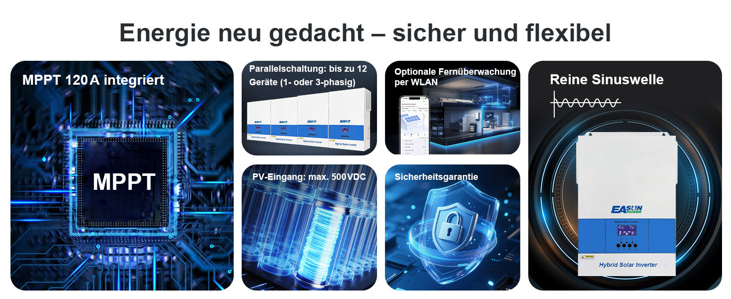 Der EASUN 48V 6200W Solar-Wechselrichter vereint Solareinspeisung, Netzstrom und Batterieladung in einem leistungsstarken Gerät – für den einfachen Aufbau eines zuverlässigen und effizienten Heimenergiesystems.