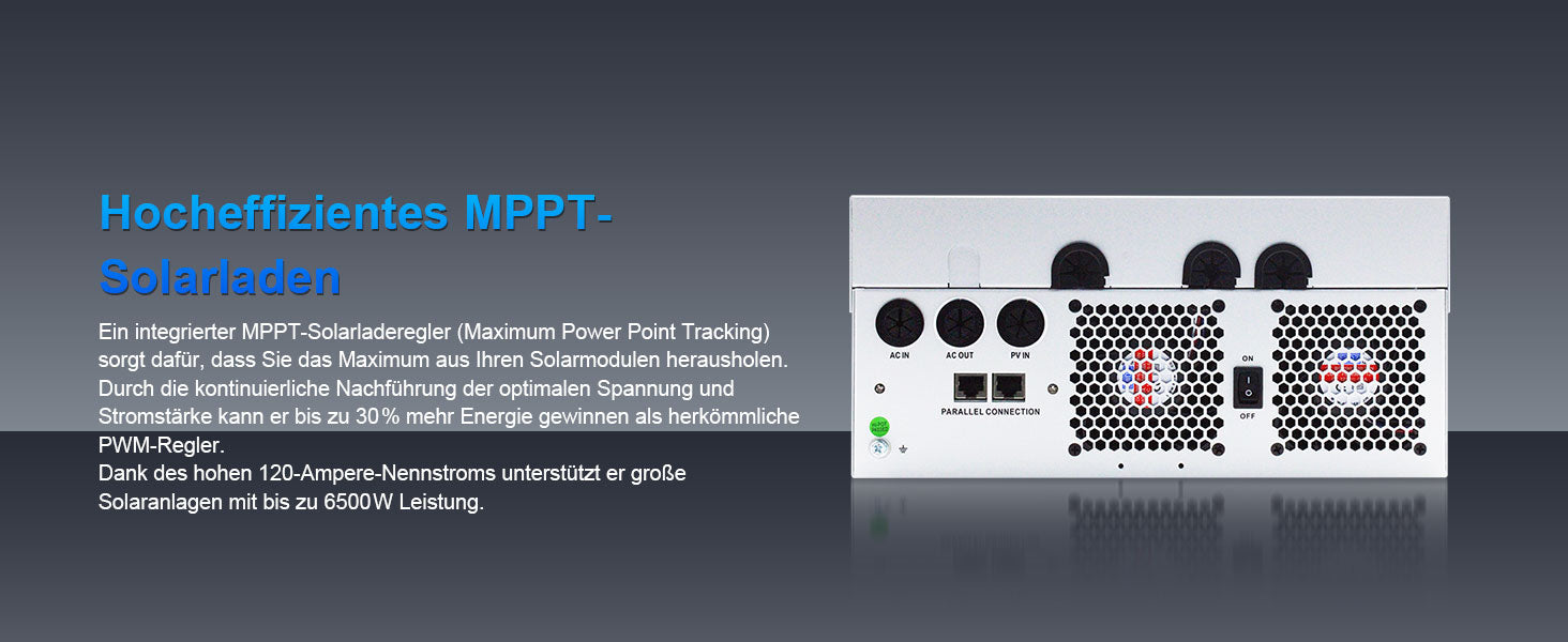 Der MPPT-Regler benötigt mindestens 120VDC PV-Eingang, um zu starten. Es wird jedoch eine empfohlene Eingangsleistung von 250VDC oder höher empfohlen, um eine stabile Stromausgabe unter Last zu gewährleisten.