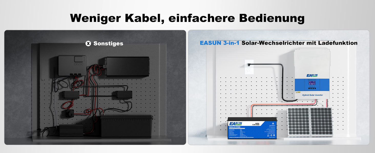 Schluss mit Kabelsalat! Der EASUN POWER Wechselrichter vereint MPPT-Laderegler, Wechselrichter und Ladegerät in einem kompakten Gerät – spart Platz, vereinfacht die Installation und sorgt für eine aufgeräumte Anlage.