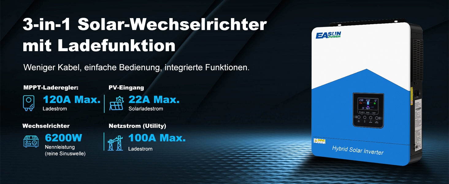 Der All-in-One Hybrid-Wechselrichter & Batterielader von EASUN POWER vereint einen MPPT-Laderegler mit 120 A und einen 6,2-kW-Wechselrichter in einem einzigen Gerät. Das reduziert die Verkabelung auf ein Minimum und maximiert gleichzeitig die Funktionalität – ideal, um PV- und Heimspeichersysteme schlank und effizient aufzubauen.