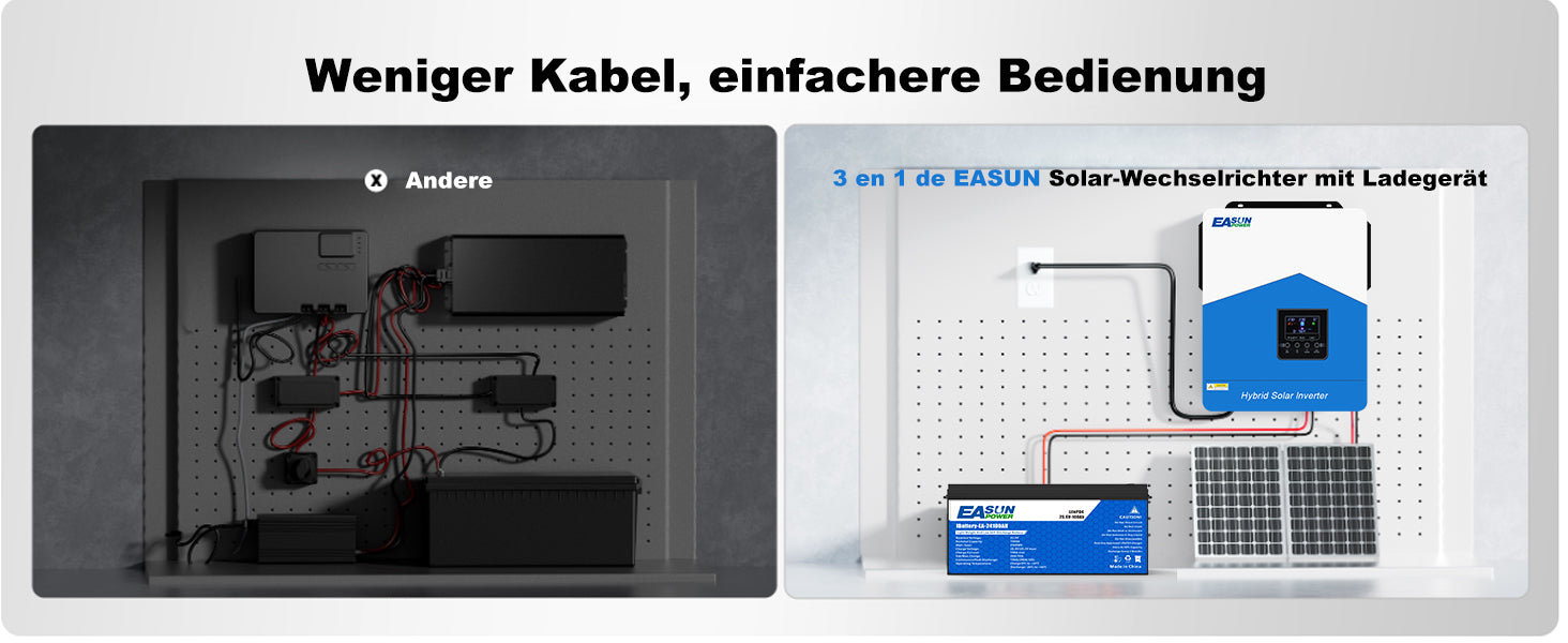 Schluss mit Kabelsalat und verstreuten Komponenten! Der EASUN POWER Solar-Wechselrichter & Batterielader integriert MPPT-Regler, Wechselrichter und Ladegerät in einem kompakten Gerät – spart Installationsfläche, vereinfacht die Verkabelung und macht Ihr Heimspeichersystem aufgeräumter, sicherer und leichter zu verwalten.