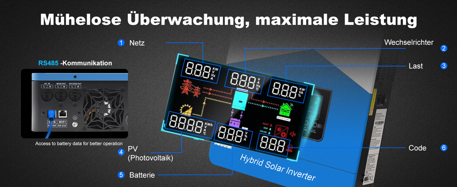 Behalten Sie die Kontrolle mit dem integrierten LCD-Display und der RS485-Kommunikation. Überwachen Sie Systemdaten, erhalten Sie Warnmeldungen und verfolgen Sie Ein-/Ausgangsleistung – alles in Echtzeit. Mit klarer Sicht auf alle Kennwerte optimieren Sie Energieverbrauch und Batteriezustand.