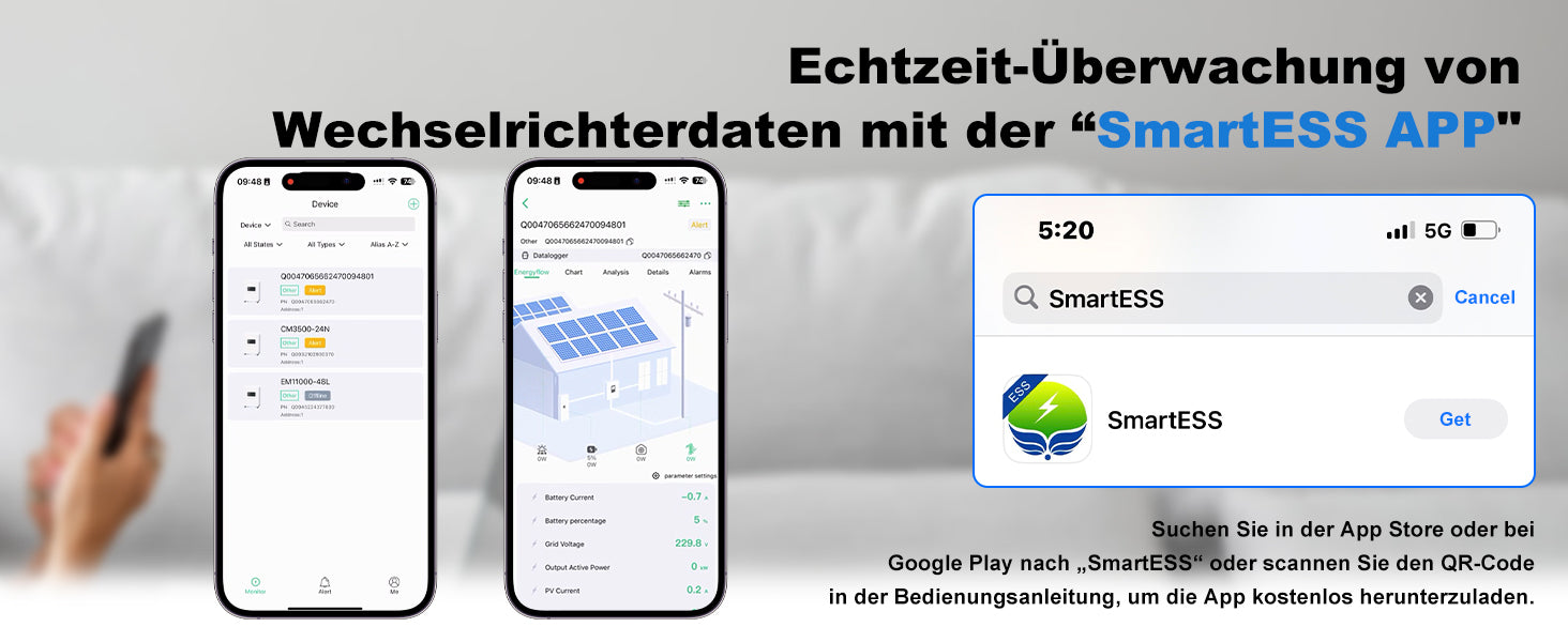 Sehen Sie Batterie- und Systemdaten in Echtzeit direkt in der SmartESS-App. Suchen Sie nach „SmartESS“ im Apple App Store oder bei Google Play, oder scannen Sie den QR-Code im Handbuch, um die App kostenlos herunterzuladen. So überwachen und steuern Sie die Wechselrichterleistung bequem per Smartphone oder Tablet.