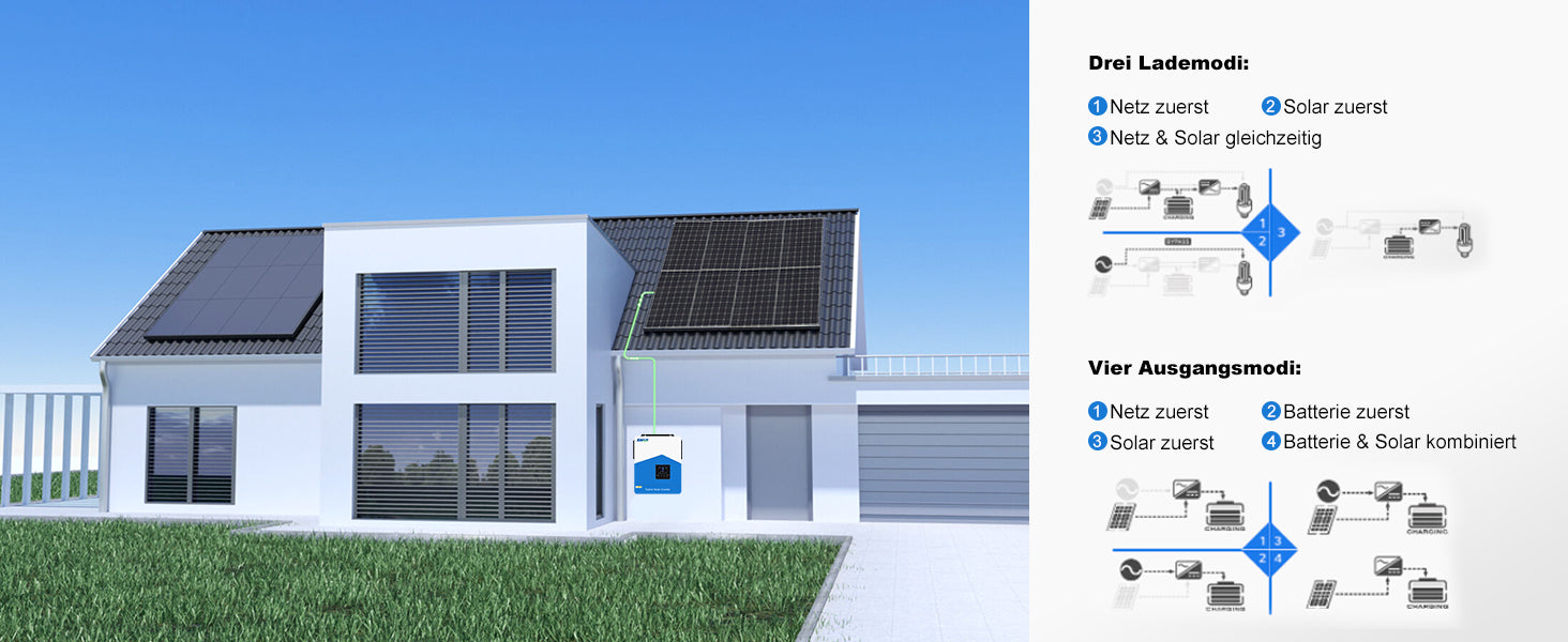 - Supports Multiple Output Priorities – UTL, SOL, SBU oder SUB frei wählbar für optimales Energiemanagement