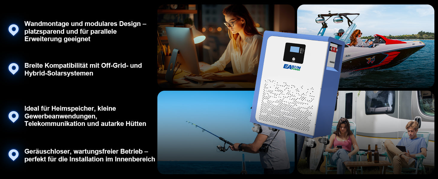Das wandmontierte, modulare Design spart wertvollen Platz und ermöglicht parallele Erweiterungen für wachsende Energieanforderungen. Dank der breiten Kompatibilität mit Off-Grid- und Hybrid-Solarsystemen ist es ideal für Notstromversorgung zu Hause, kleine Gewerbebetriebe, Telekommunikationsanlagen und autarke Hütten. Mit seinem geräuschlosen, wartungsfreien Betrieb eignet es sich perfekt für die Innenmontage.
