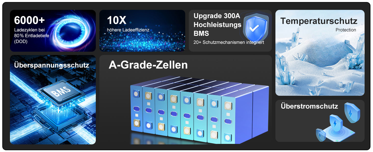 Die Batterie ist mit ≥ 6000 Zyklen bei 80 % Entladungstiefe und 25 °C bewertet. Typische Lithium-Eisen-Phosphat-Zellen halten je nach Nutzung 5000–16.000+ Zyklen.