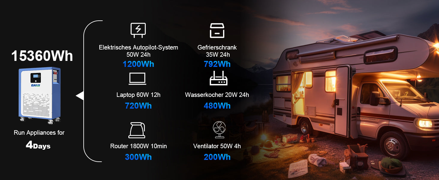 - Alltagstaugliche Laufzeiten – 1000W Klimaanlage (15,36 Std.), 60W TV (256 Std.), 900W Mikrowelle (17,07 Std.), 800W Kaffeemaschine (19,2 Std.), 800W Kühlschrank (19,2 Std.)