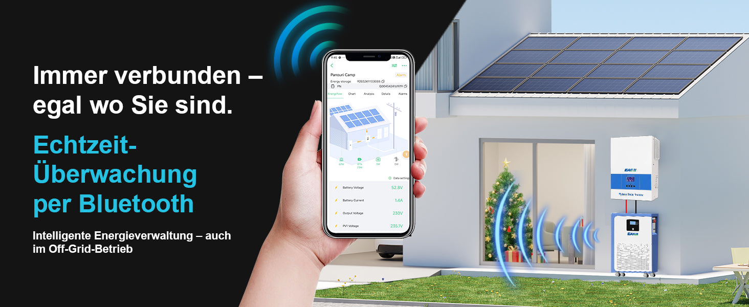 Das integrierte Smart Management System überwacht in Echtzeit Spannung, Strom, Temperatur und Ladezustand, um jederzeit eine stabile und sichere Leistung zu gewährleisten. Über das eingebaute LED-Display lassen sich alle wichtigen Parameter direkt am Gerät ablesen. Zusätzlich ermöglicht die Bluetooth- und WiFi-Konnektivität die Verbindung mit einer mobilen App, um Werte bequem auf dem Smartphone oder Tablet zu verfolgen. Über die Kommunikationsschnittstellen RS485/RS232/CAN kann das System nahtlos mit den meisten Wechselrichter-Marken integriert werden.