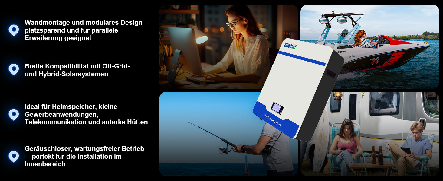 Das wandmontierte, modulare Design spart wertvollen Platz und ermöglicht parallele Erweiterungen für wachsende Energieanforderungen. Dank der breiten Kompatibilität mit Off-Grid- und Hybrid-Solarsystemen ist es ideal für Notstromversorgung zu Hause, kleine Gewerbebetriebe, Telekommunikationsanlagen und autarke Hütten. Mit seinem geräuschlosen, wartungsfreien Betrieb eignet es sich perfekt für die Innenmontage.