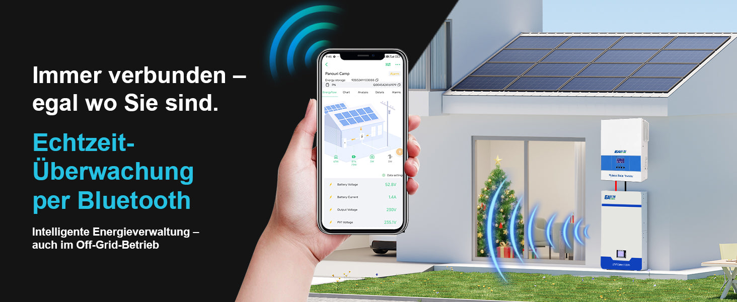 Das integrierte Smart Management System überwacht in Echtzeit Spannung, Strom, Temperatur und Ladezustand, um jederzeit eine stabile und sichere Leistung zu gewährleisten. Über das eingebaute LED-Display lassen sich alle wichtigen Parameter direkt am Gerät ablesen. Zusätzlich ermöglicht die Bluetooth- und WiFi-Konnektivität die Verbindung mit einer mobilen App, um Werte bequem auf dem Smartphone oder Tablet zu verfolgen. Über die Kommunikationsschnittstellen RS485/RS232/CAN kann das System nahtlos mit den meisten Wechselrichter-Marken integriert werden.