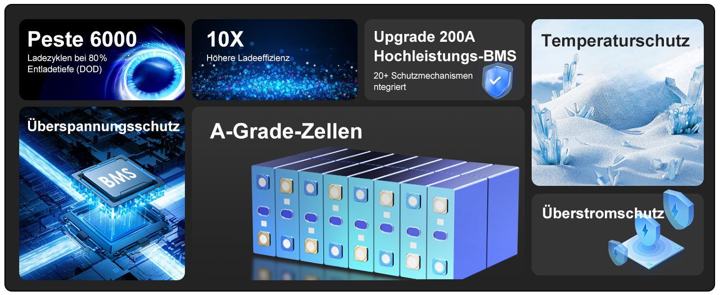 Die Batterie ist mit ≥ 6000 Zyklen bei 80 % Entladungstiefe und 25 °C bewertet. Typische Lithium-Eisen-Phosphat-Zellen halten je nach Nutzung 5000–16.000+ Zyklen.